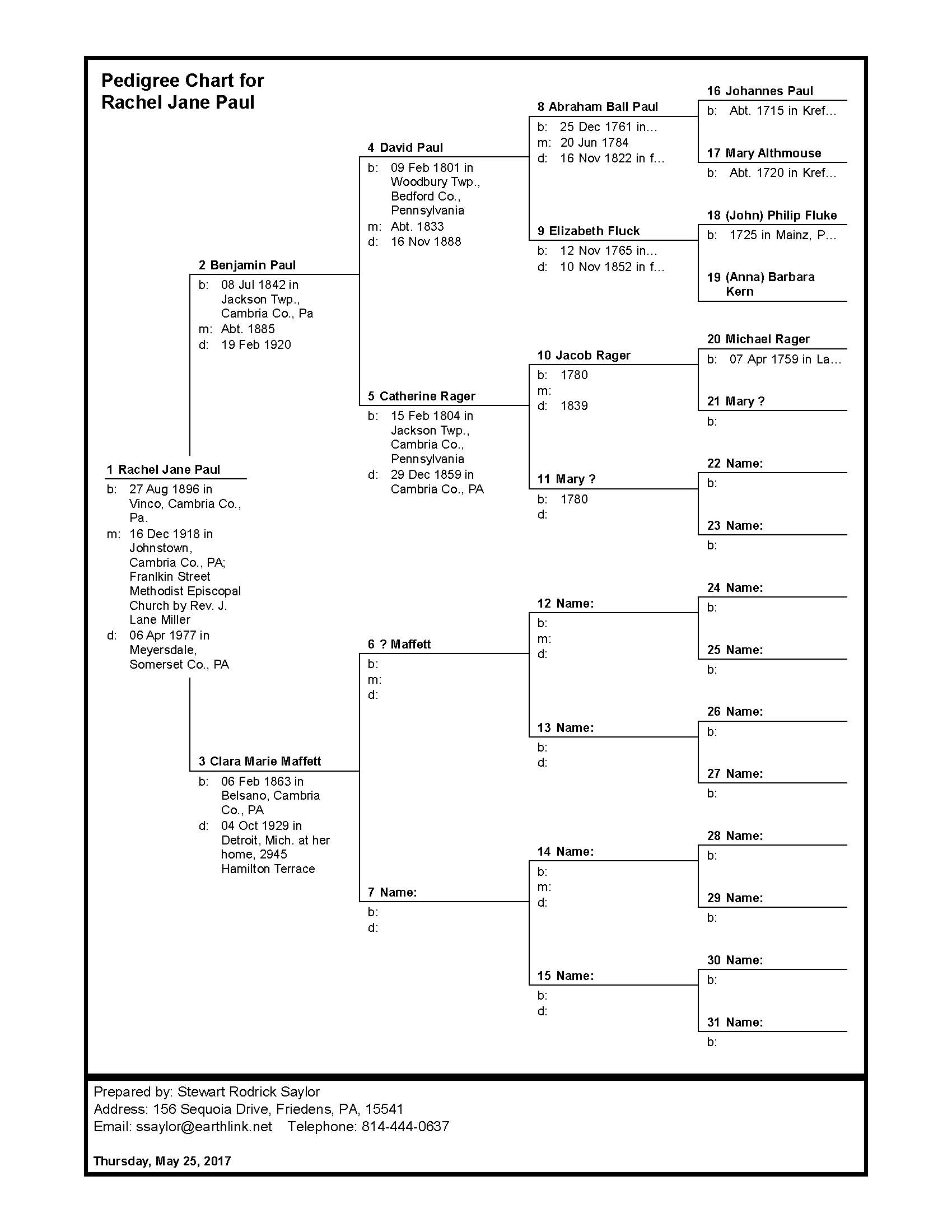 For my Saylor first cousins, I recently began exploring mom Saylor's ancestors for SAR links. Mom Saylor was born in Cambria County. My local SAR chapter is the Somerset Cambria Chapter, so a Cambria County link would be nice.