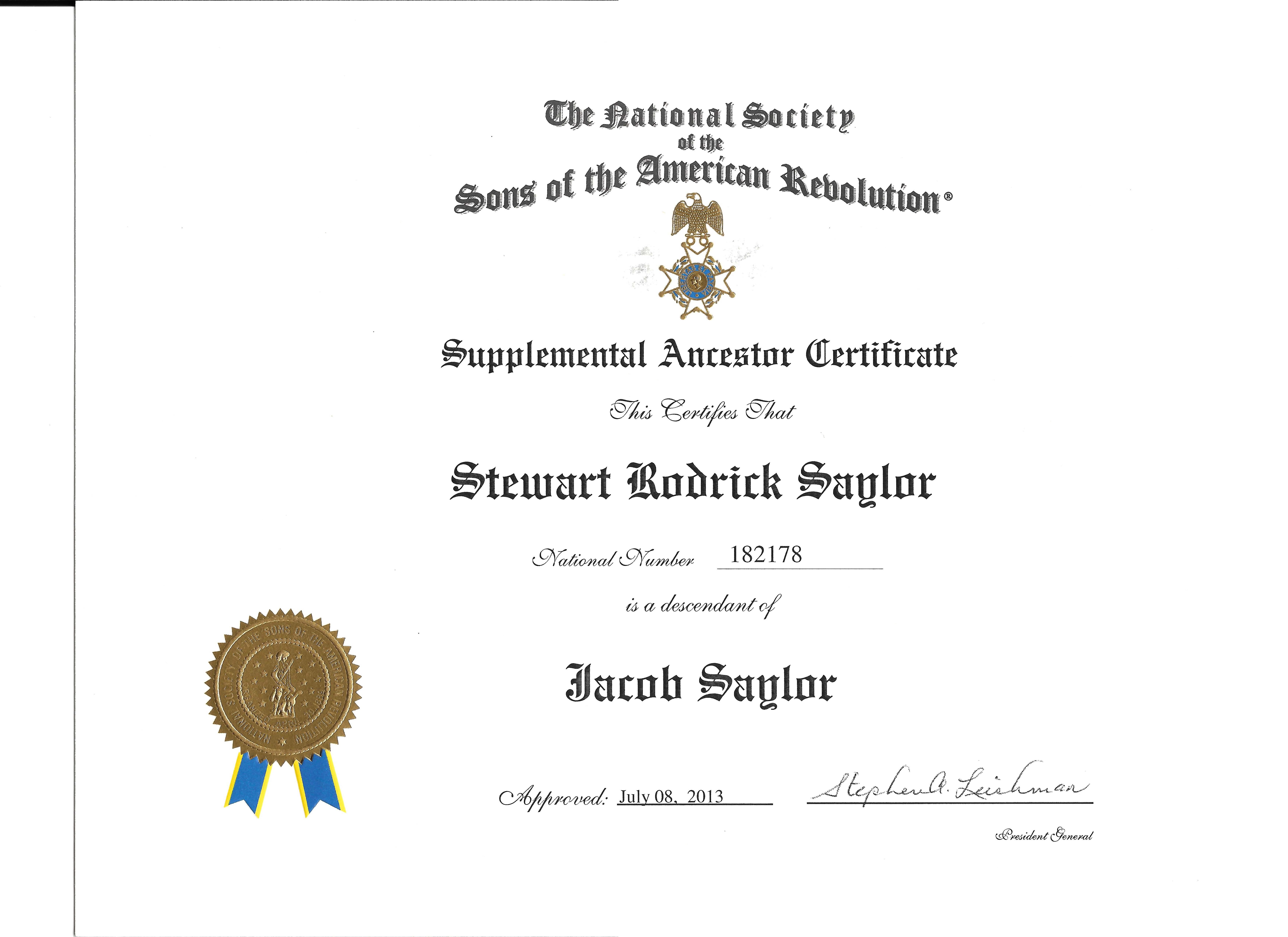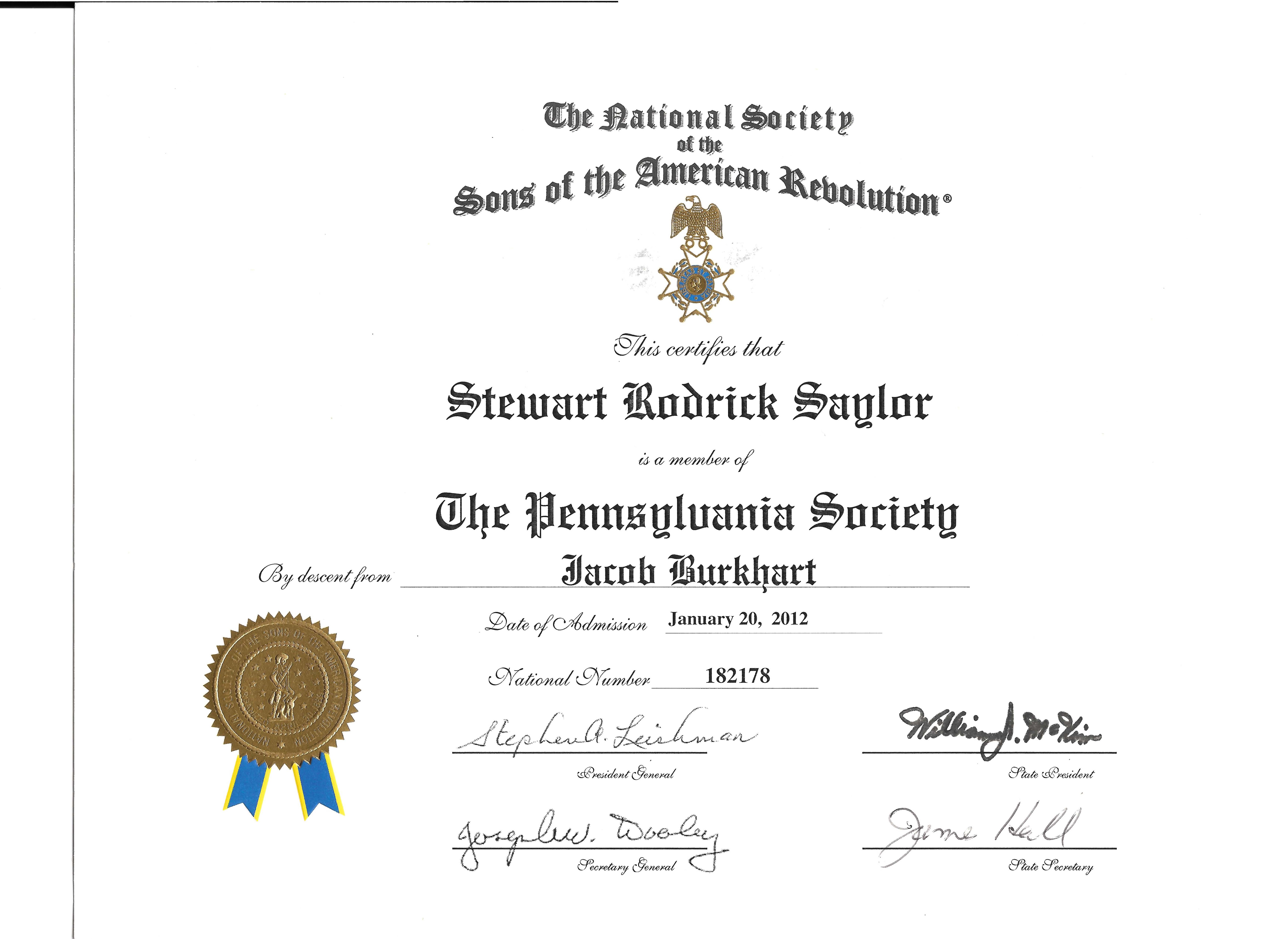 After many years of delay, I began an application for SAR membership during 2011. That application was based upon my ancestor Jacob Burkhart. The application was approved January 20, 2012.